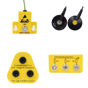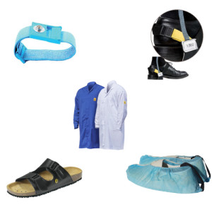 Opaski nadgarstkowe, przewody spiralne, opaski na obuwie, ochraniacze jednorazowe na obuwie z uziemieniem, obuwie antystatyczne, fartuchy, koszulki polo, rękawiczki i inne.