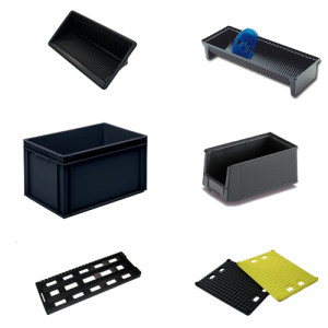 Pojemniki do składowania w stosie, kontenerki na drobne elementy oraz do przechowywania szpul z komponentami. Chronią zawartość przed wyładowaniami elektrostatycznymi.